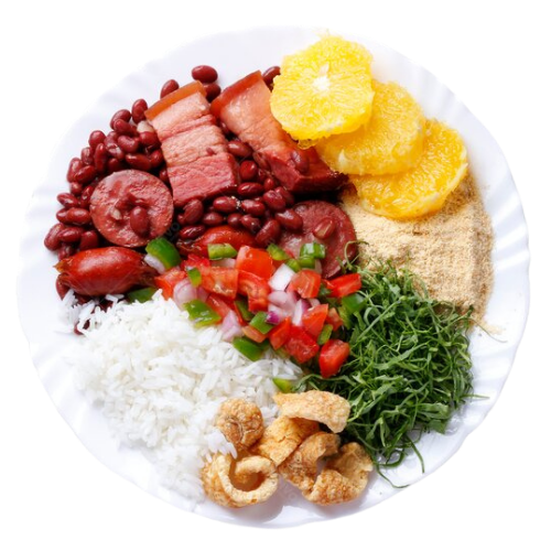 This traditional Brazilian feast features a hearty, slow-simmered black bean stew loaded with smoky pork belly, cured sausages, and tender rib meat. The rich flavors of the stew are perfectly balanced by a side of fluffy white rice, buttery sautéed collard greens, and toasted cassava flour for an authentic texture. To complete the experience, the plate is brightened with zesty fresh orange slices and a crisp tomato-onion vinaigrette, all served with a side of golden, house-made pork cracklings for the ultimate crunch.
