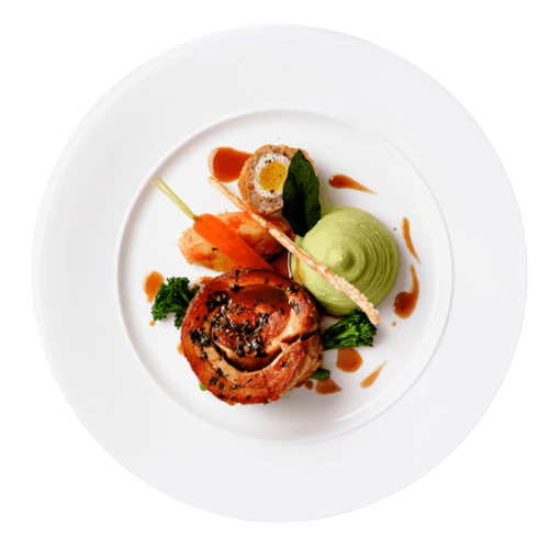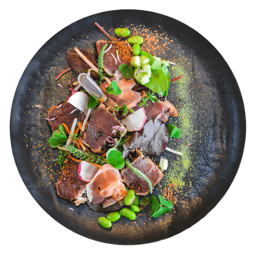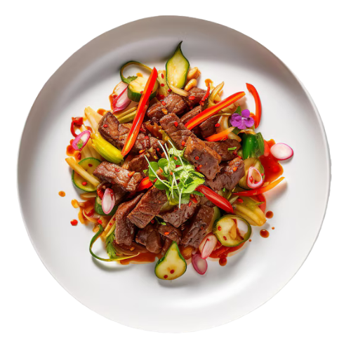 This signature masterpiece features premium, sesame-crusted Ahi Tuna expertly seared and served alongside delicate ribbons of pickled ginger, crisp radish, and fresh edamame. The dish is artfully composed on a slate platter with a vibrant miso-citrus reduction, garden-fresh microgreens, and a light dusting of togarashi spice for a subtle, warming finish. Every element is carefully balanced to deliver a clean, sophisticated, and multi-textured dining experience.